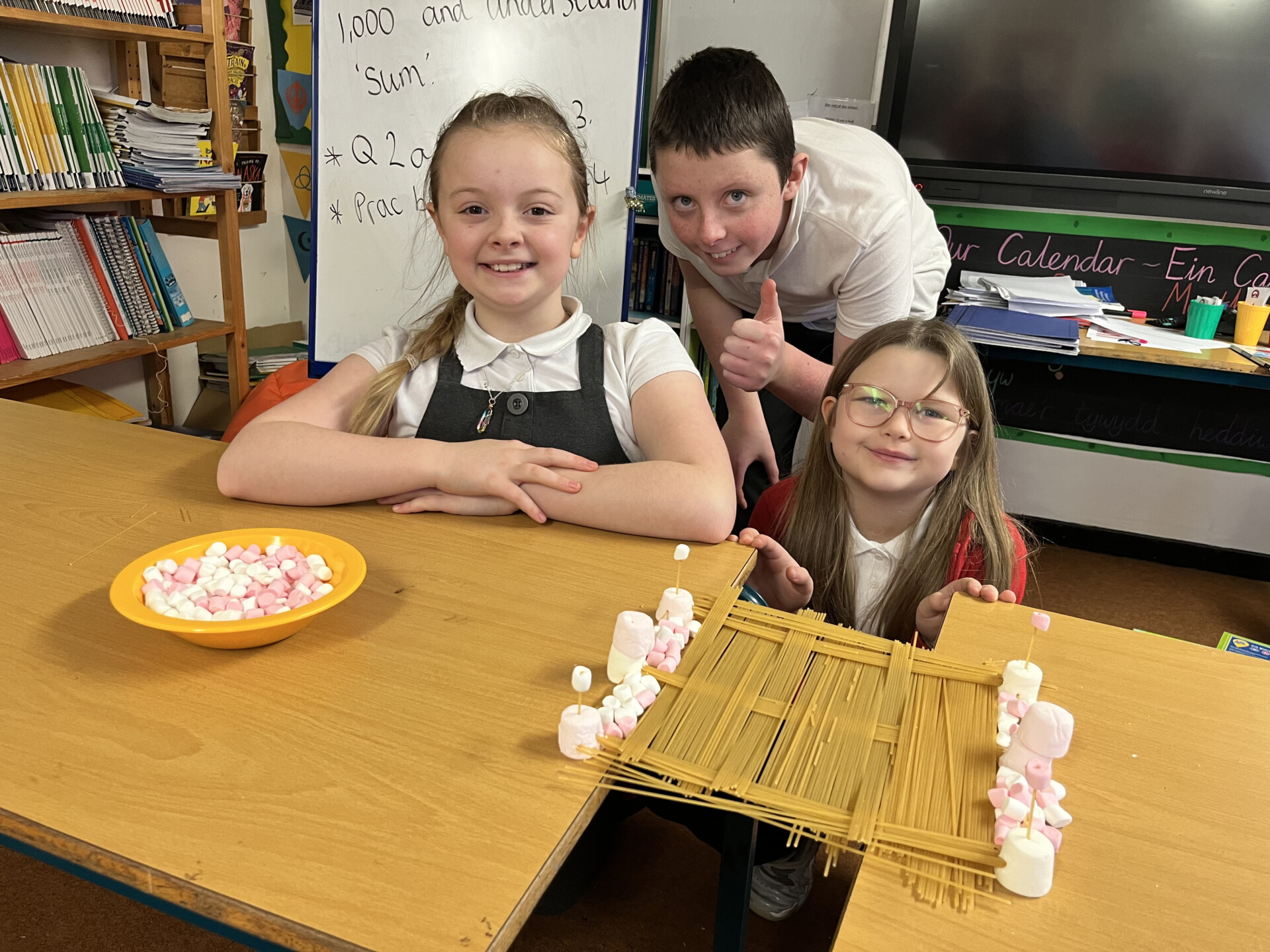 Celyn class had fun using spaghetti and marshmallows to build a good, strong bridge structure. The children had to work well in groups, use communication skills and assign each other job roles. Their task was to build a bridge structure that would bridge a 20cm gap and hold a 1lb weight for 30 seconds. All bridges were successful! Here are some of them: